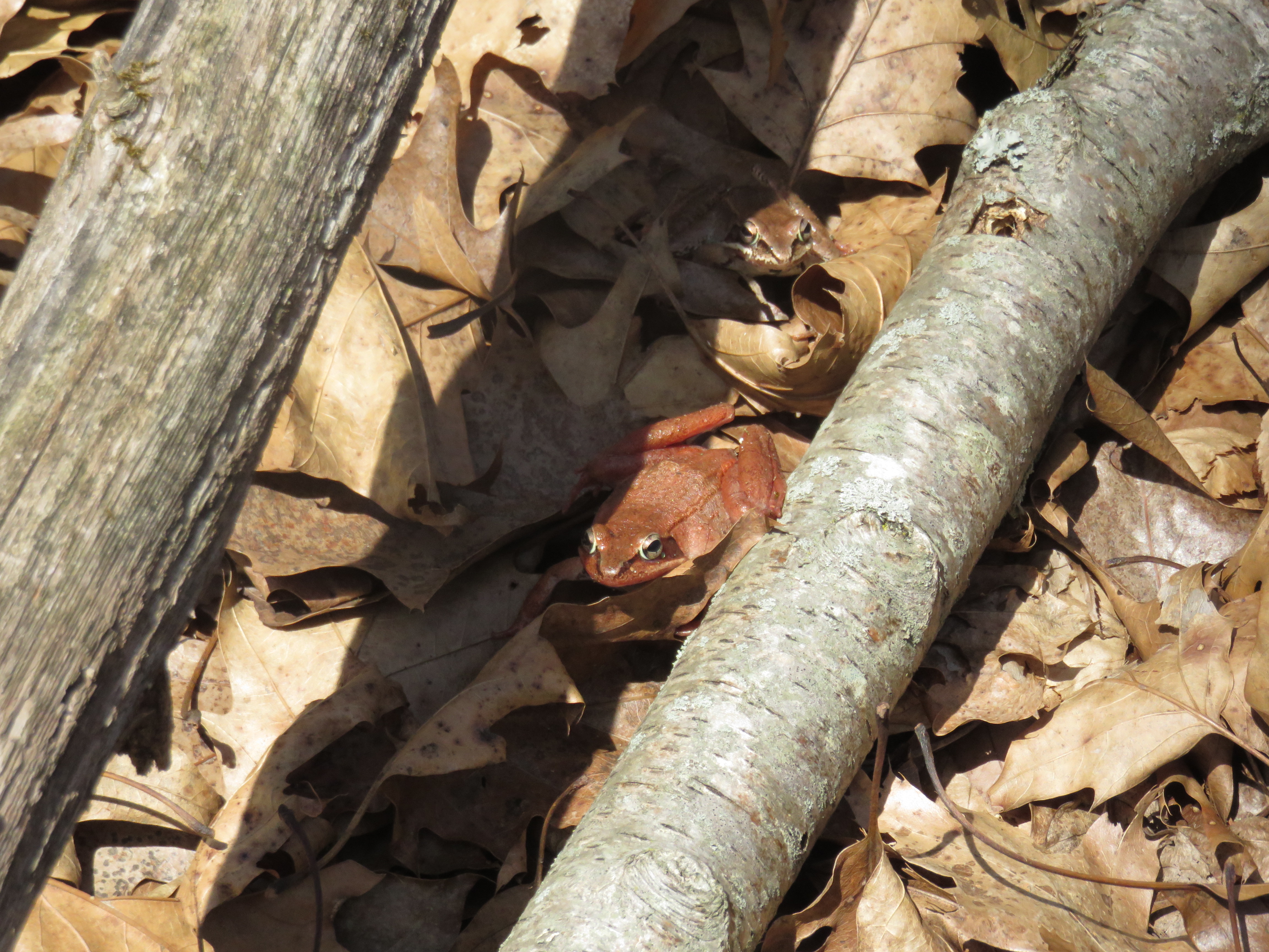 What really blew my mind though was when I realized there were frogs tumbling down the hill behind me towards the water. I mean, they were hopping, but the steepness of the slope gave them a rather clumsy look as they negotiated it. The good migration night was Thursday, and it was several dry days later that they were traveling right at midday. Did they emerge slowly on Thursday night, then take their time warming up before heading out? Wood frogs can survive being frozen and then thawing out naturally. Could that process have played a role in the delay?
