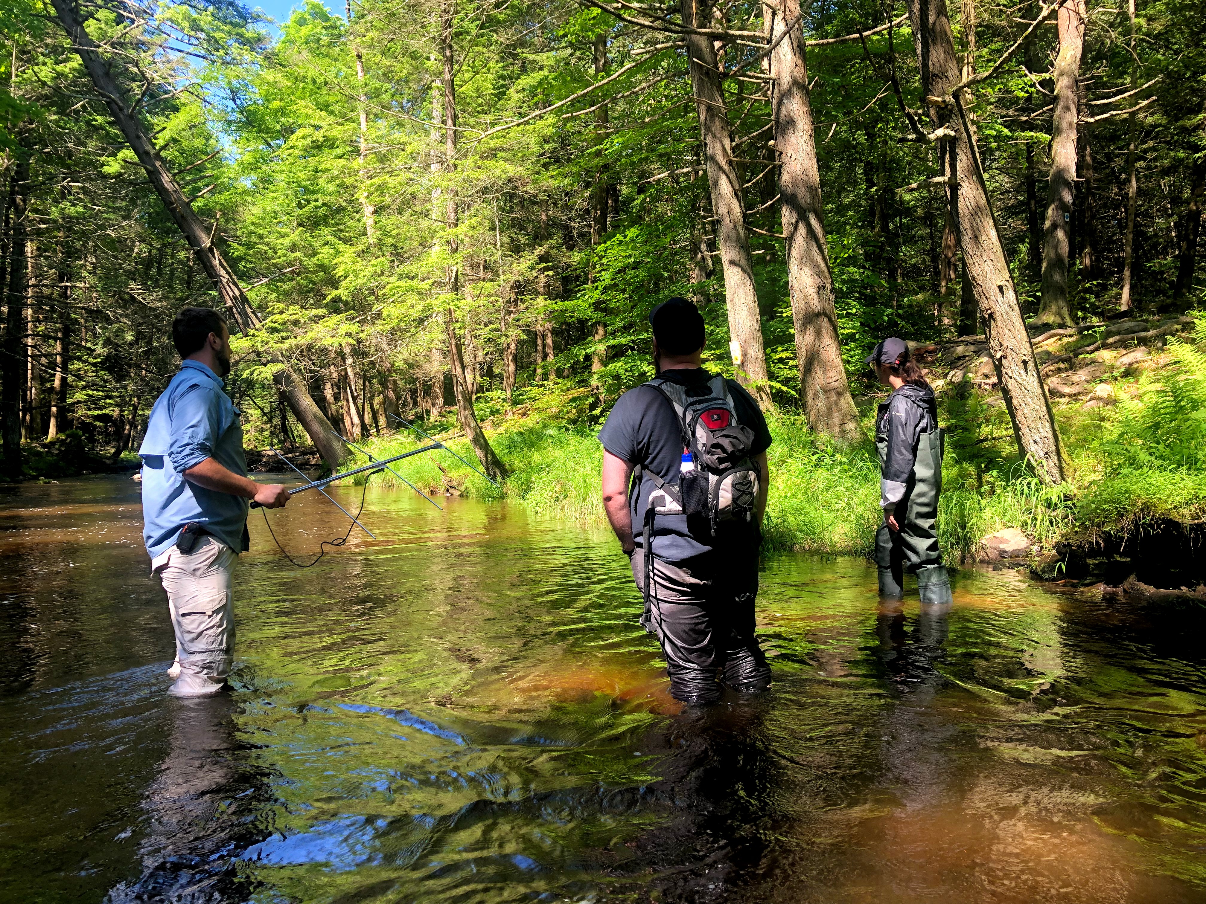 You hold the receiver, attached to a large antenna, and as you get closer to the animal, the receiver makes regular and increasingly loud beeping sounds. But it’s trickier than that–water, slopes and trees can all cause bounceback. And you can find yourself crossing through head-high brambles and waist-deep swamps or streams in pursuit of the signal. Often you find a pretty good signal coming from almost 180 degrees in front you, and you have to adjust what’s called the gain lower to differentiate between whether it’s strongest straight ahead, or veering to the left or right. I found the visual representation of the beeps to be the most helpful when comparing–they look like rising bars in a bar chart, and I often paused to compare which direction was showing a slightly higher bar.