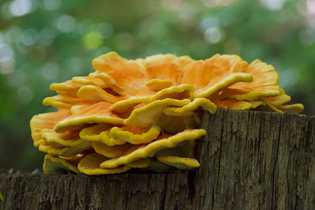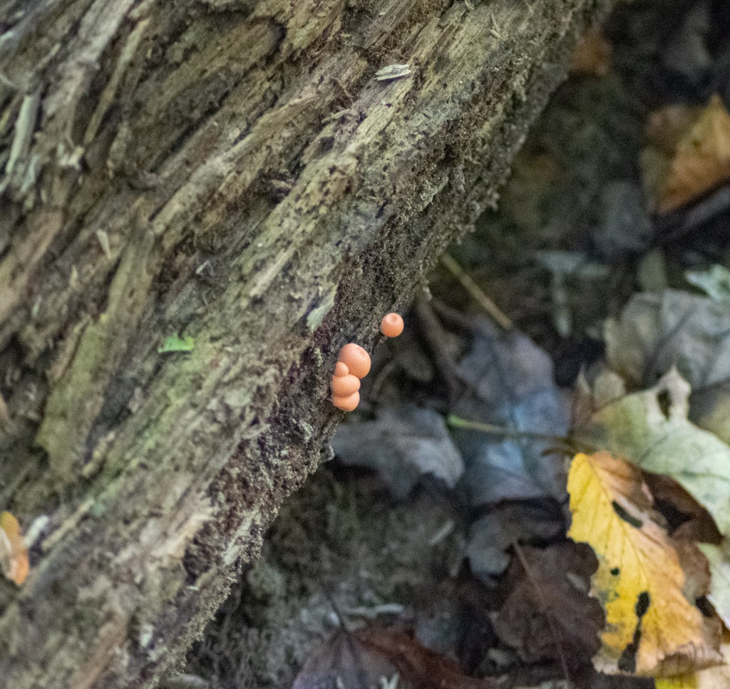 Sometimes when looking for fungus, you end up finding slime mold, which is also fun. They used to be considered fungi, but are now classified as a type of amoeba. They are single-celled, but can get together to form a larger organism that can do exciting things like reproduce. One that I’ve recently gotten to know has the charming name of wolf’s milk, or toothpaste slime mold. A few weeks ago I was leading some second graders on a nature walk and showed them the puffy pinkish-orange blobs growing on a log. I popped one to show the fluorescent liquid inside, and it splattered orange spots all over my shirt. Some of the kids were altogether too concerned about whether it was going to stain. It’s nature, kids! It’s ok to get dirty. Get out there and pop some slime molds!