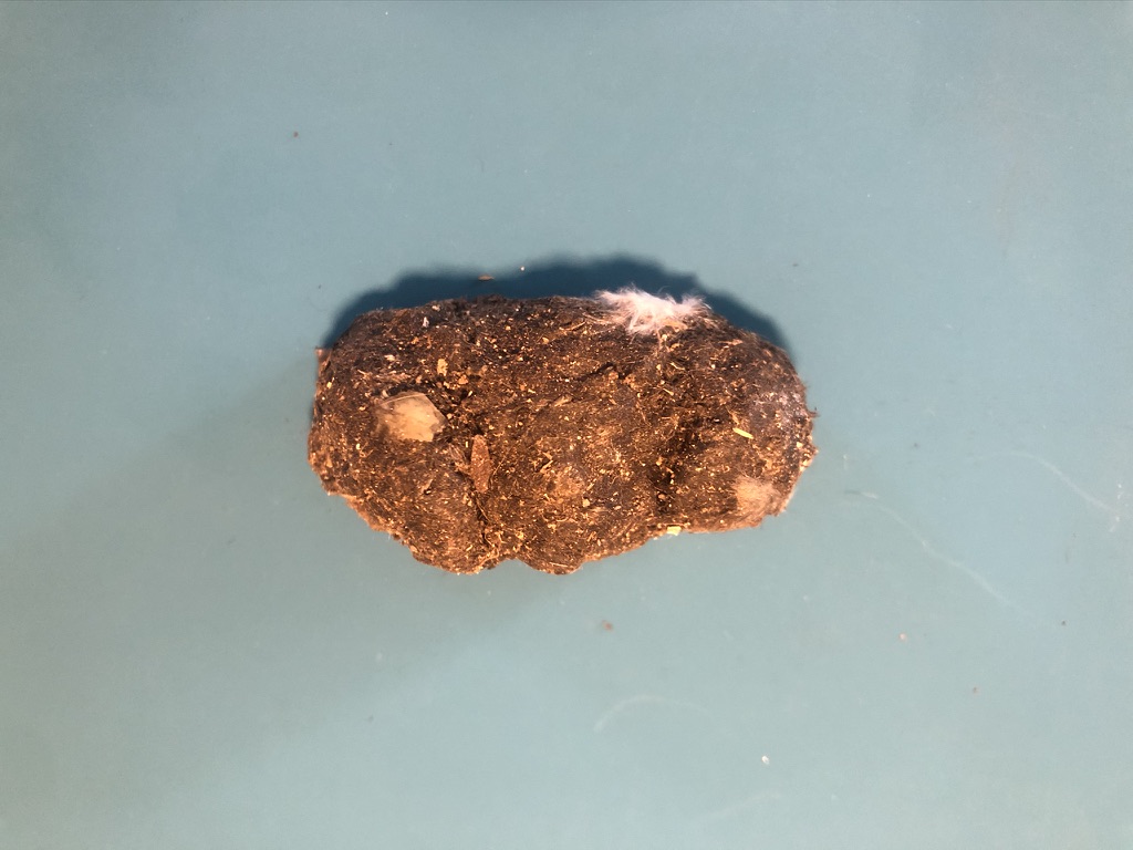 The pellets are made up of bone, fur, feathers and whatever else the bird has eaten but cannot process. To be honest, since the bones, fur and feathers are fairly readily identifiable, I find myself wondering what all the gray-brown stuff between them is.