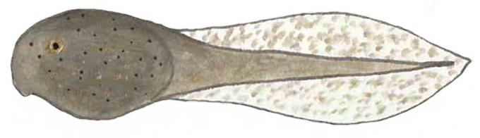 Eggs hatch into tadpoles, which are generally herbivorous larvae. Like most amphibians, frogs metamorphose from aquatic larvae to adults that can be more or less terrestrial. First they grow back legs, then front legs, then the tail is subsumed. Almost every organ changes, as their tiny mouths with teeth for tearing plant platter morph into larger mouths with sticky tongues, their skulls change shape, and from cartilage to bone, and their gills recede and lungs enlarge.