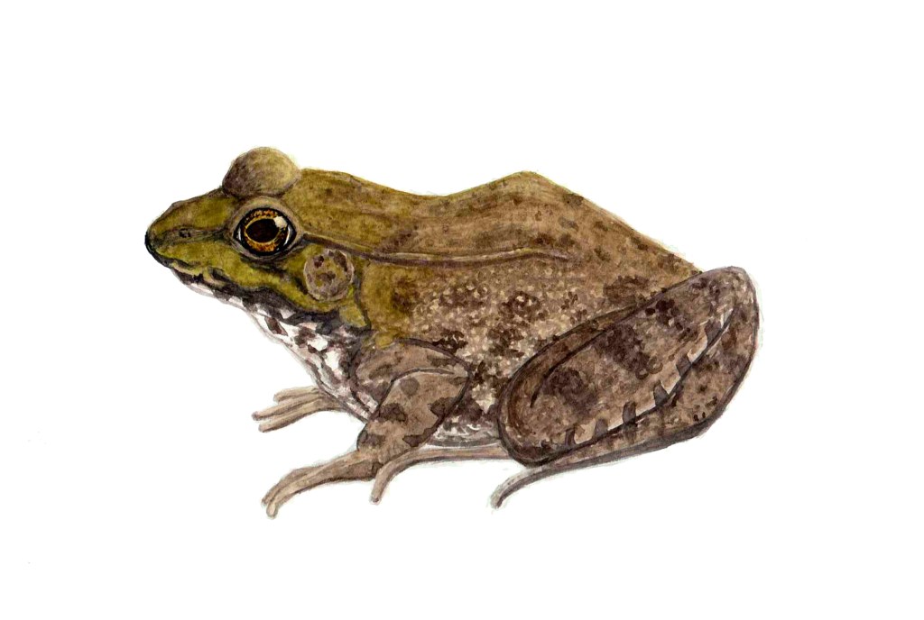 They are easily differentiated from bullfrogs by the ridge running from their eye all the way down their back. A bullfrog’s ridge circles the tympanum (the round spot behind their eye, basically their eardrum), leaving the back smooth.